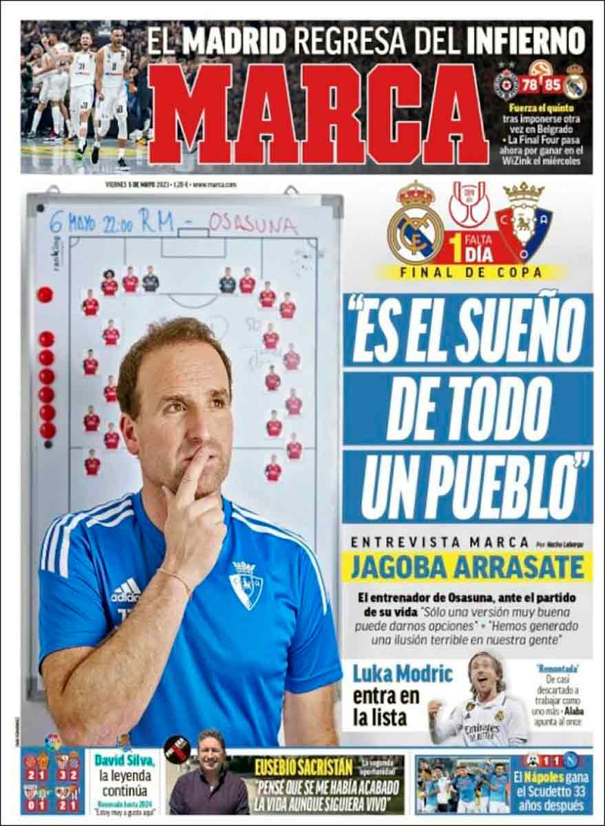 Marca sin embargo no se centra en el lado madridista, porque para eso Marca es el diario de todos. Pone el foco en el lado osasunista con una entrevista con Arrasate, el excelente técnico rojillo. Es un equipo que merece respeto, y su trayecto hasta plantarse en la Final también es digno de tenerse en cuenta. Se aplicarán con rigor y es posible que con más efusividad de la deseable, pero para eso, para frenar el juego duro, está el árbitro. Es aquí donde el lector exhala una carcajada seca y descreída. Sánchez Martínez es un exponente vergonzoso del negreirato que pervive, y un somero repaso a sus actuaciones con el Real Madrid basta para helar la sangre en las venas. “Te la has jugado mucho, Albiol”.
