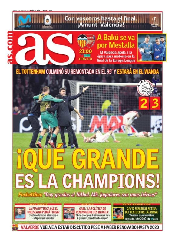 Por lo demás, los que no vierais ayer la otra semifinal no sabéis lo que os perdisteis. La remontada del Tottenham ante un Ajax inolvidable constituyó otra página gloriosa de fútbol, fe y determinación, todo ello tan sólo un día después del épico espectáculo de Anfield. Enhorabuena a los Spurs cuyo entrenador, el inimitable Pochettino, lleva escrita su candidatura al banquillo del Madrid all over, allá para cuando Zidane tenga en su haber otras tres Champions.