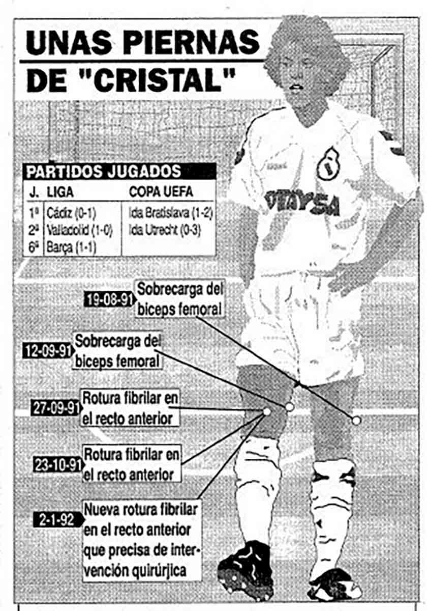 Un caso que ha marcado la historia del club blanco y los recuerdos de los aficionados cuando se habla de un jugador de cristal que se lesionaba con gran facilidad fue el de Robert Prosinecki. Un centrocampista ofensivo que cautivó en el Estrella Roja y llamó la atención de Ramón Mendoza, que se rascó el bolsillo y pagó 450 millones por su traspaso. En la revisión médica ya se detectaron algunos problemas pero no se dio marcha atrás al fichaje. El croata comenzó la temporada 1991-1992, pero a los cuatro partidos sufrió una lesión muscular que se encadenó con otras dos y más tarde una rotura fibrilar del recto anterior de su pierna derecha. En enero de 1992 parecía recuperado pero otra vez una nueva rotura fibrilar que necesitó incluso intervención quirúrgica. Resto de la temporada en blanco y el Madrid acusando al Estrella Roja de estas lesiones por la enorme cantidad de veces que infiltraron al jugador cuando militaba allí. El jefe de los servicios médicos del club blanco, el Dr. Herrador, mostraba su tristeza en la prensa. “Es ilógico, increíble y frustrante”, llegó a declarar. Prosinecki permaneció dos temporadas más en la capital donde sí pudo acumular más apariciones con la camiseta merengue aunque las recaídas y los problemas musculares no llegaron a desaparecer del todo. En total: 350 días de ausencia en tres cursos.