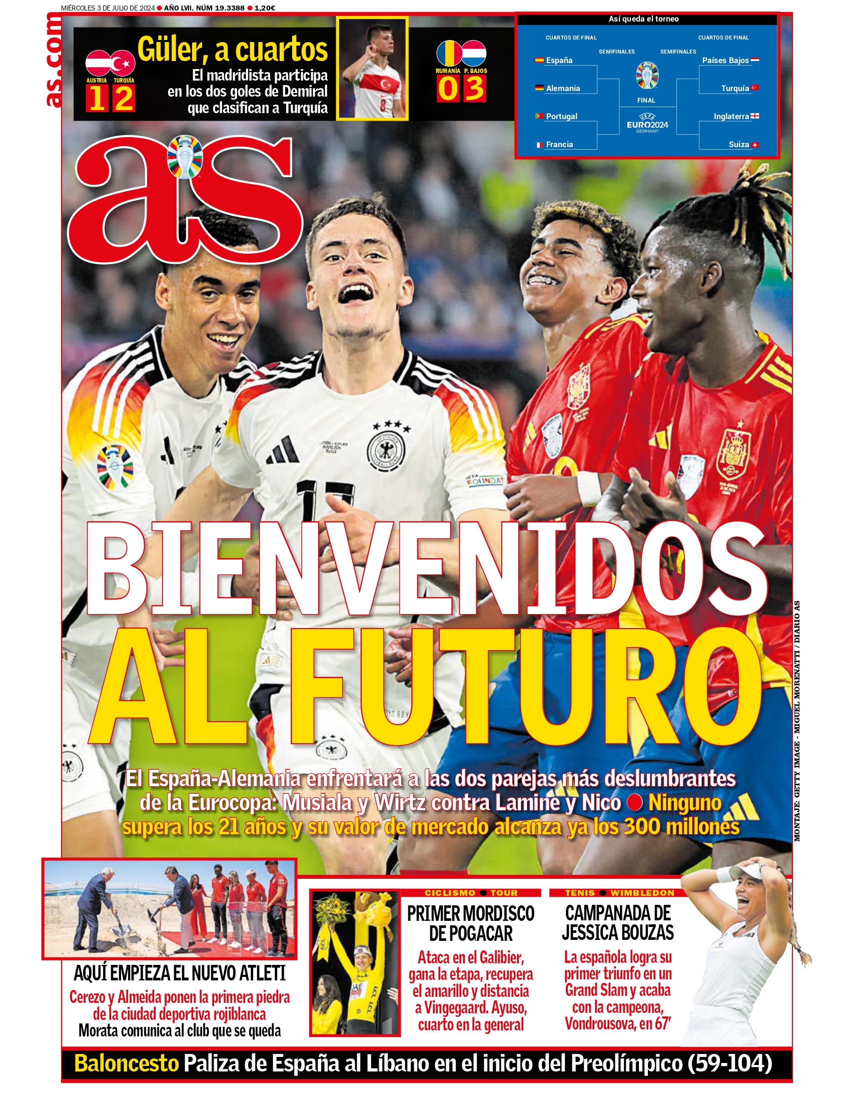 Marca lo afronta por el lado del relevo generacional que se insinúa en este duelo hispano-germano, con jóvenes promesas en ambos lados de la batalla que están tomando el relevo de las viejas glorias, jugadores tan imaginativos y talentosos como los que aparecen en la fotografía. Menos mal que algo de sitio deja también As en la portada a Arda Güler, otro pelotero joven e inmensamente creativo que ayer participó de manera decisiva en la clasificación de Turquía para cuartos. Los dos goles de su selección vinieron de sendos saques de esquina sensacionalmente botados por el ya universalmente llamado TurcoMío.