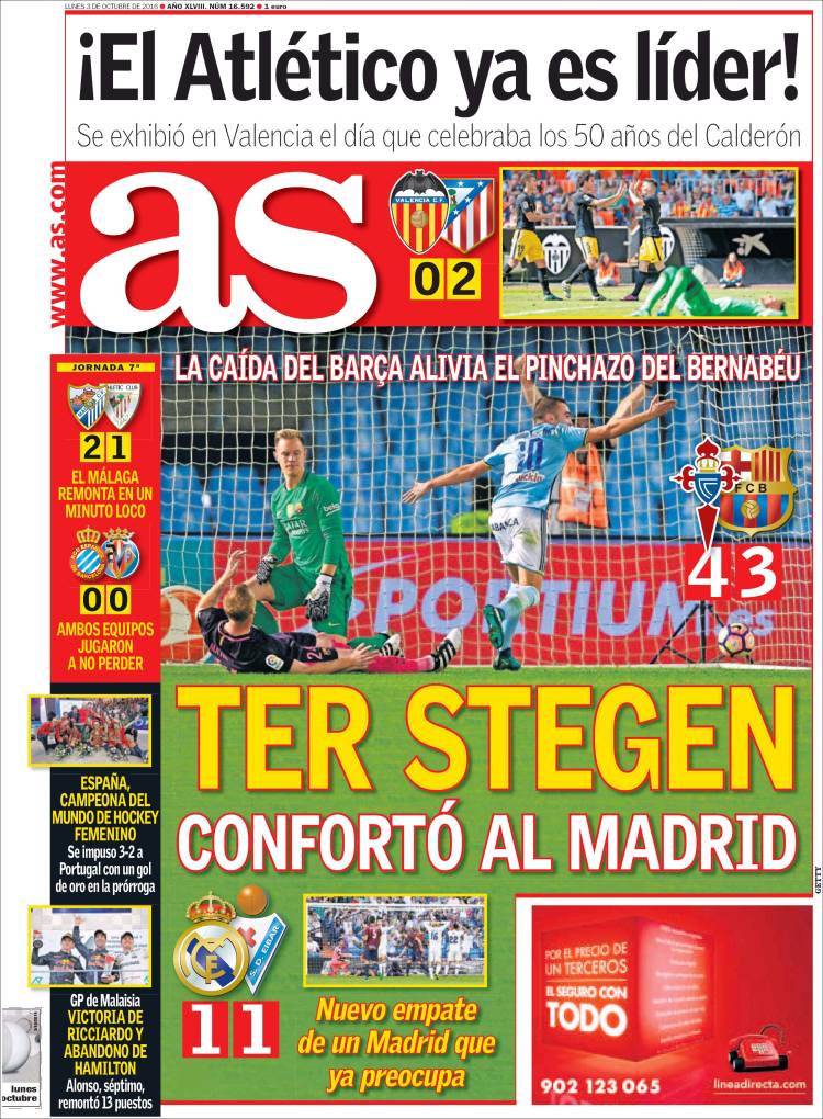 Buenos días. Por primera vez desde que un 21 de mayo del año pasado surgiera de entre las sombras La Galerna, hoy miramos cara a cara a la prensa deportiva patria, o a lo que de ella se asoma en las ventanas de sus portadas, para decirles: hoy habéis sido magnánimos con el Real Madrid. Ter Stegen y el Atleti, cada uno en su estilo, han entonado las arias que restan protagonismo al balbuceo torpe de nuestro Madrid, birlándoles el spotlight de los titulares de los diarios, y menos mal.