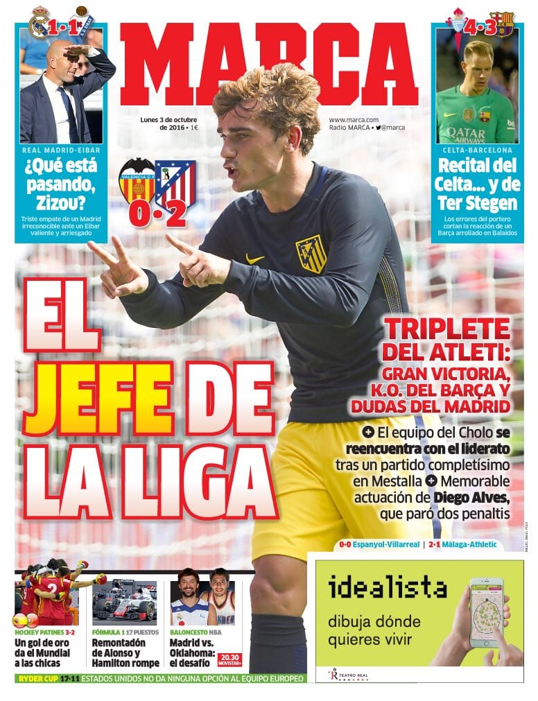 En cuanto a la portada del As"EL ATLETICO YA ES LIDER",comentar¿cuantas jornadas lleva el Madrid de lider y en solitario?Srs.(es un decir)de As,nos deben,unas cuantas portadas,pero claro.........baybay