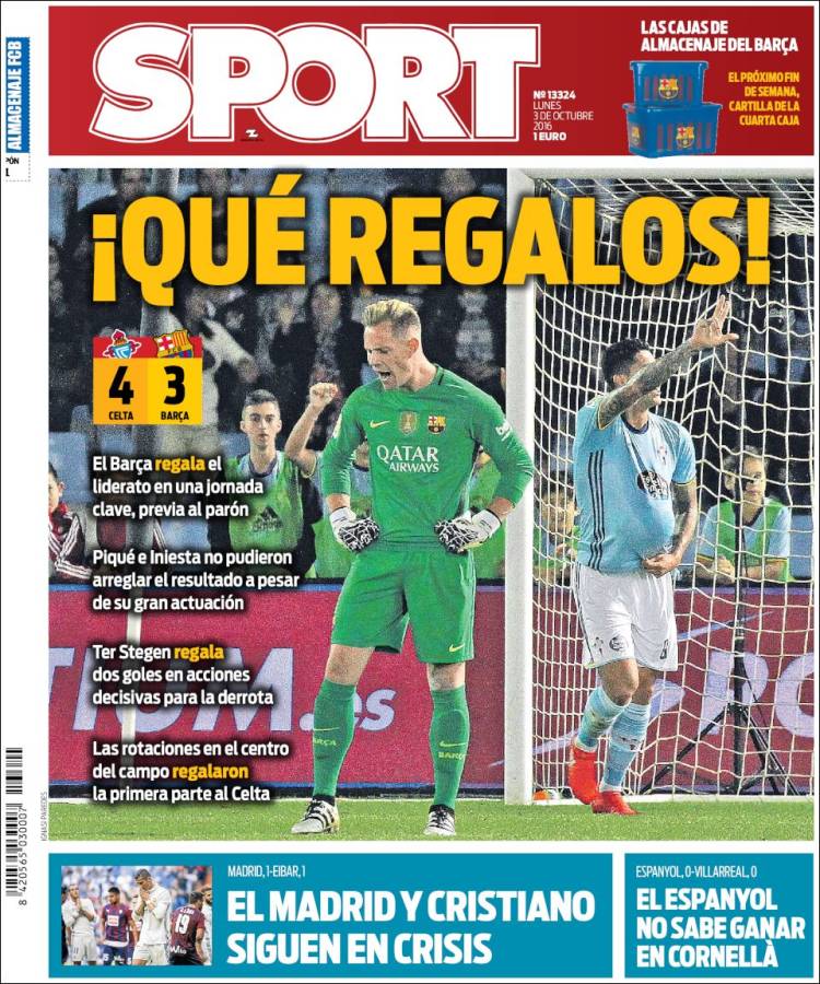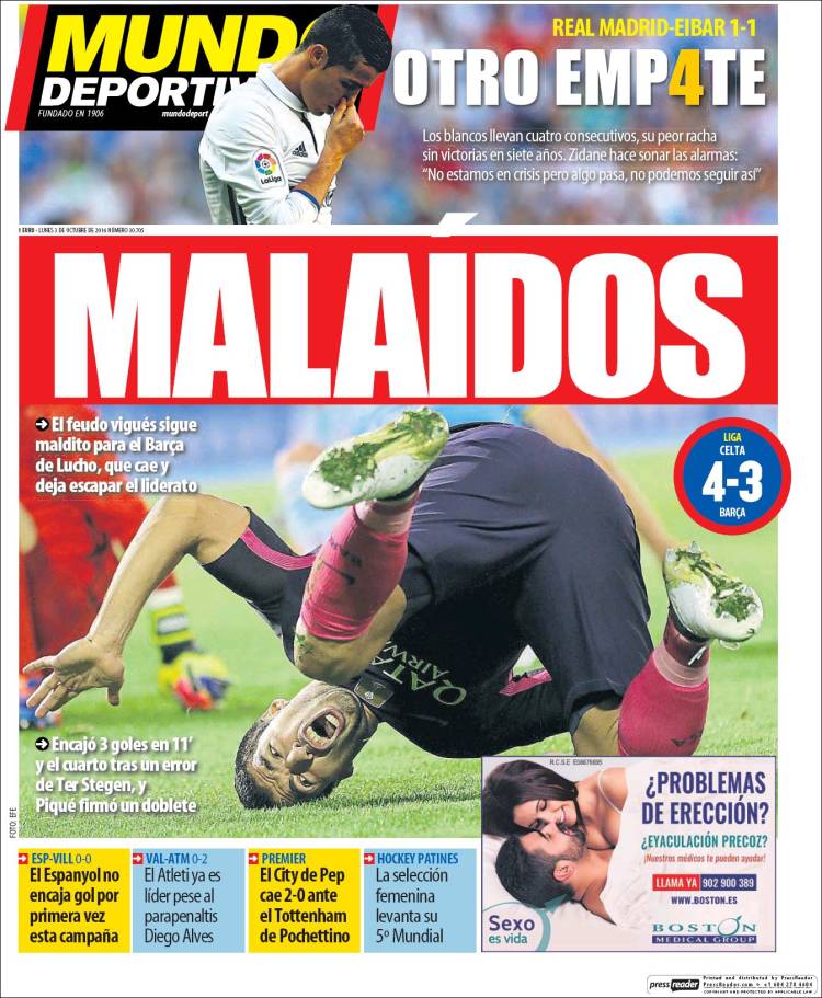 Formulamos la pregunta antes de dar paso a las portadas catalanas, bálsamo de nuestro padecimiento. La pregunta es precisamente esa: ¿es legítimo que sean bálsamo? El madridismo desesperado proclamó ayer, claro, que no, antes bien al contrario: la derrota del Barça en Balaídos (o en "Malaídos", como titula con alguna gracia esta vez Mundo Deportivo) debe hacer que el madridismo se hunda todavía más en un pozo sin fondo de frustración e ira, por cuanto de no haber empatado ayer el Madrid seguiría líder y habría ampliado su ventaja sobre el Barça. Nosotros respondemos que la amplió de hecho (aunque fuese un punto en lugar de tres), y que tienes que estar deseando profundizar en el dolor como para ser madridista y no encontrar algún alivio en las dos portadas con las que os vamos a dejar. Sin que ello suponga obstáculo para resaltar también lo contrario, es decir, que empatar en el Bernabéu con el Éibar tiene que ser grave, que lo es además porque corona una serie de empates con juego errático y que hay que tomar decisiones mientras rezamos porque el parón de selecciones no incremente aún más la lista de efectivos (incomprensiblemente larga) que se incorporan a la enfermería del Real Madrid.