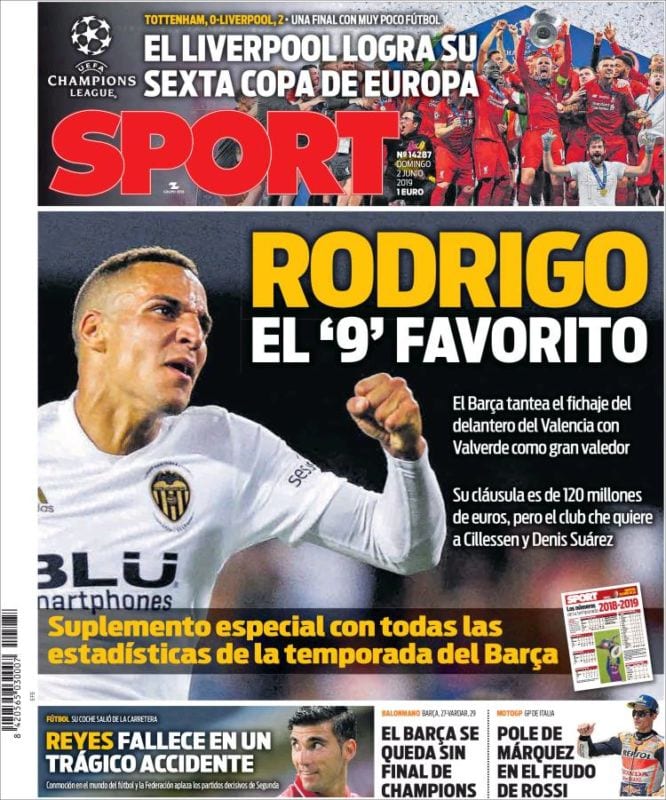 Menos mal que la rueda sigue girando y, estadísticas aparte, el 9 favorito de Sport es Rodrigo, delantero del Valencia por el que, según se dijo, se interesó el Real Madrid el verano pasado a razón de tropecientosmil millones que, de un modo siempre mesurado, pide el Valencia cada vez que el Madrid se acerca a preguntar. Veremos cuál es la cantidad del fichaje si es el Barcelona quien lo intenta. Será que la piscina-ombligo es un aval del que otros no podemos gozar.