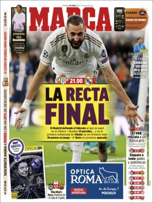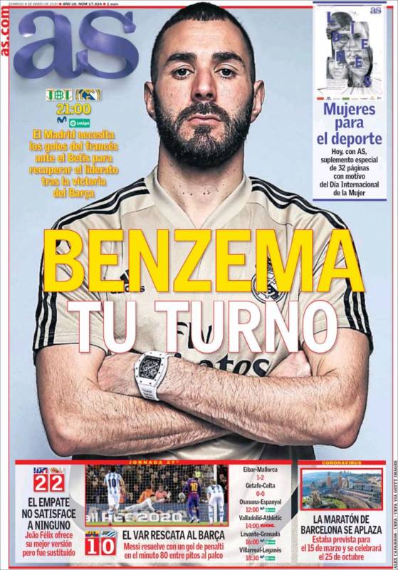 Por su parte, la prensa madrileña coincide en llamar rescate a lo que disfrutó el Barcelona ayer en su partido contra la Real Sociedad, cosa que, por cierto, no deja de encajar bien con aquello del asalto que comentábamos más arriba. Y también coincide la prensa de Madrid en traer a Benzema a sus portadas, tal y como coincide la culé en traer a Messi. Ignoramos por qué ahora nuestro querido Karim es motivo de esta atención especial, pero digamos que nunca nos parece mal momento para que este artista del baile metido a delantero de fútbol luzca como merece, aunque solo sea porque escatimar en posibilidades de belleza nos parece imperdonable. Ojalá este primer plano de Benzema se traslade hoy al campo del Betis y pueda el Madrid seguir líder de esta Liga hasta el próximo asalto.