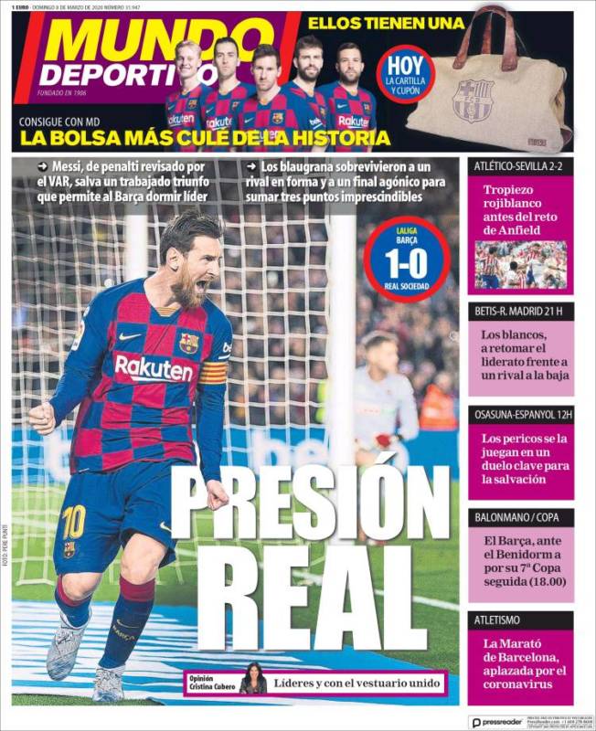 Pero lo que era asalto en Sport, es supervivencia en Mundo Deportivo. De trabajado triunfo hablan en su portada, como queriendo decir (ocultar) que el partido del Barcelona fue un truño de tres pares de narices pero sin decirlo, porque ya se sabe que los truños de partido siempre son de otros, ya se sabe que la posesión y tal, el toque y cual, el césped, la Masía y demás elementos de propaganda, la pereza infinita de la vida agotada en eufemismos del entorno culé, donde se han contruido una casita de papel y qué felices seremos los dos y qué dulces los besos serán, pasaremos la noche en la Luna leyendo Sportivo hasta el amanecer.