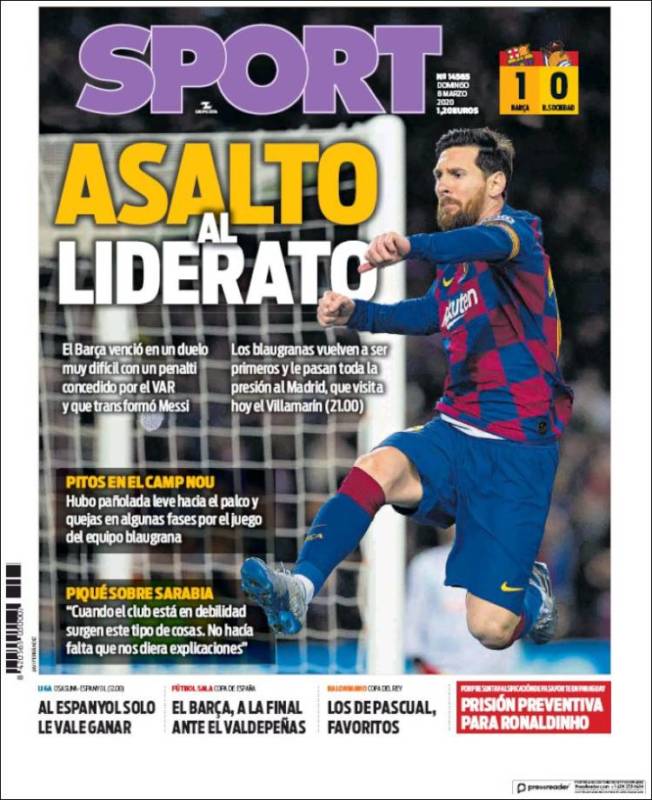 Se ha colado Freud en la redacción de Sport, o puede que se haya colado un topo, o puede -y esto es mucho menos probable- que alguno de sus responsables no aguante ya tanto maquillaje, tanto corte y confección, tanta labor de ingeniería social, y se haya atrevido a pregonar lo impregonable, a difundir lo indifundible, a reconocer lo irreconocible... Viene mesetario Sport, viene con el diccionario bajo del brazo para asumir que el liderato se toma por asalto, tal vez como quien realiza un "ataque realizado con propósito de robo a una persona o establecimiento", tal y como reza una de las posibles acepciones del término.