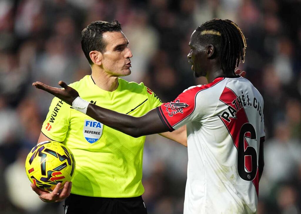 Partido intenso y de pierna dura en el que las tarjetas se vieron en la primera mitad. No quiso que se le fuese el partido al de Benidorm en los compases iniciales del choque. En las áreas hubo dos agarrones de Chavarría a Mbappé que en otros tiempos se hubieran señalado como penalti. Ahora, al CTA le parece poco estas acciones y en esas seguimos. En otra acción de Bellingham con Chavarría hubo alguna ligera protesta, los dos estaban en pugna y sujetando al rival de la camiseta pero con más fuerza por parte del rayista. También agua. Una jugada de árbitro de campo y en la que no entra el VAR que lo deja a interpretación del principal.
