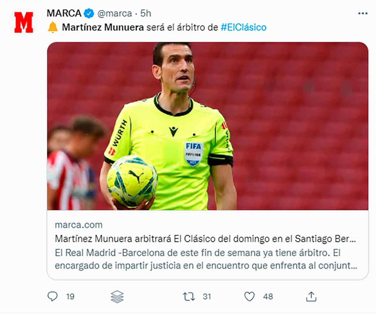 Buenos días. Ayer se conoció que el colegiado que arbitrará el Clásico el próximo domingo no es otro que Martínez Munuera. El anuncio trajo de inmediato recuerdos de la última ocasión en que este trencilla arbitró un Madrid-Barça. Ganó el Madrid gracias a un penalti cometido sobre Sergio Ramos.