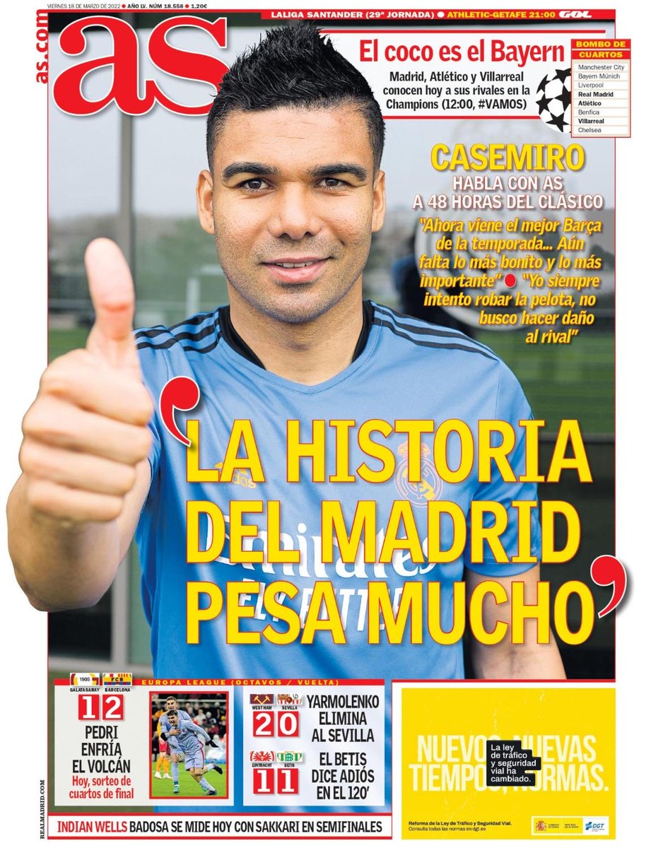 Por lo demás, y en lo relativo a las portadas del día, tenemos una entrevista de AS con Casemiro. Agradecemos mucho a uno de los principales periódicos deportivos de España que nos brinde la oportunidad de leer las impresiones del centrocampista, del cual obviamente somos devotos.