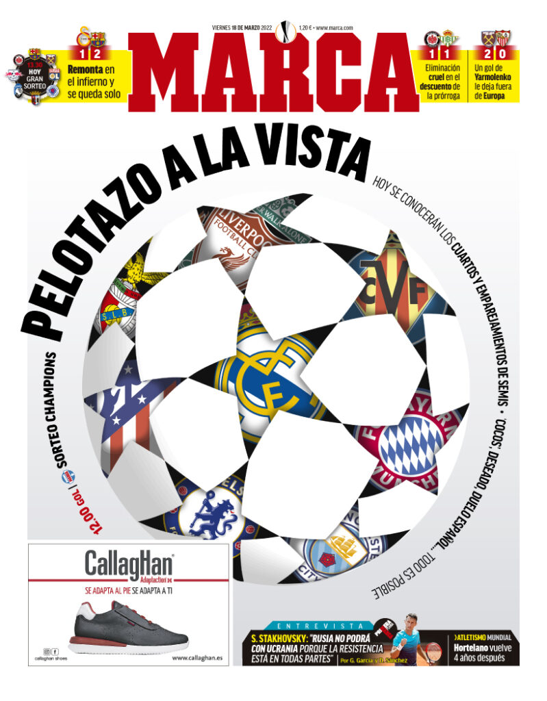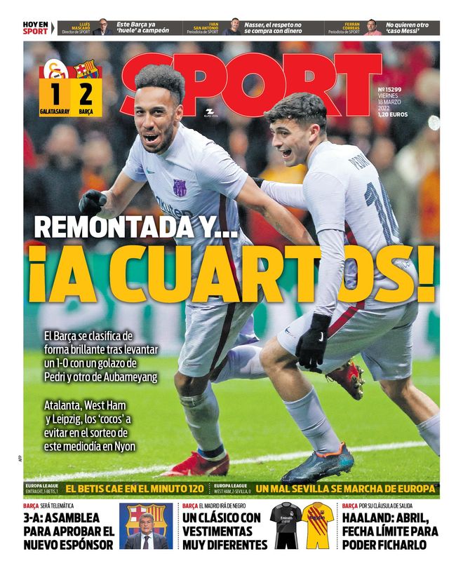 Sport refleja la victoria ante el Galatasaray, que permite al Barça pasar a Cuartos del torneo de la consolación europeo. Esto de la Europalí es como un partido para el tercer y cuarto puesto de aquellos cuadrangulares del Teresa Herrera que los más viejos recordaréis, solo que mucho más largo. Hoy se sortea el próximo rival del Barça, y atención al acojonante destacado del rotativo catalán al respecto: “Atalanta, West Ham y Leipzig, los cocos a evitar en el sorteo de este mediodía en Nyon”.