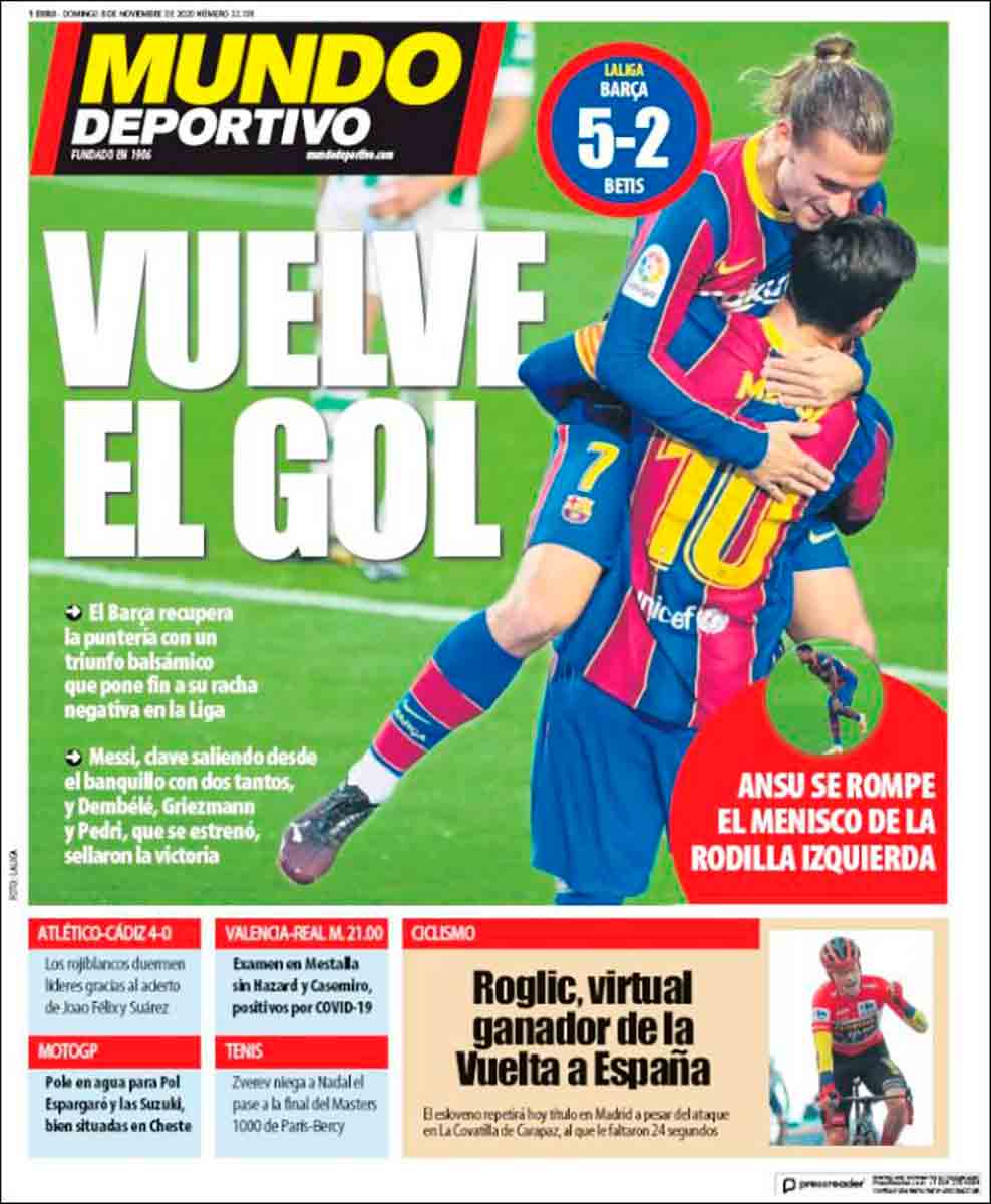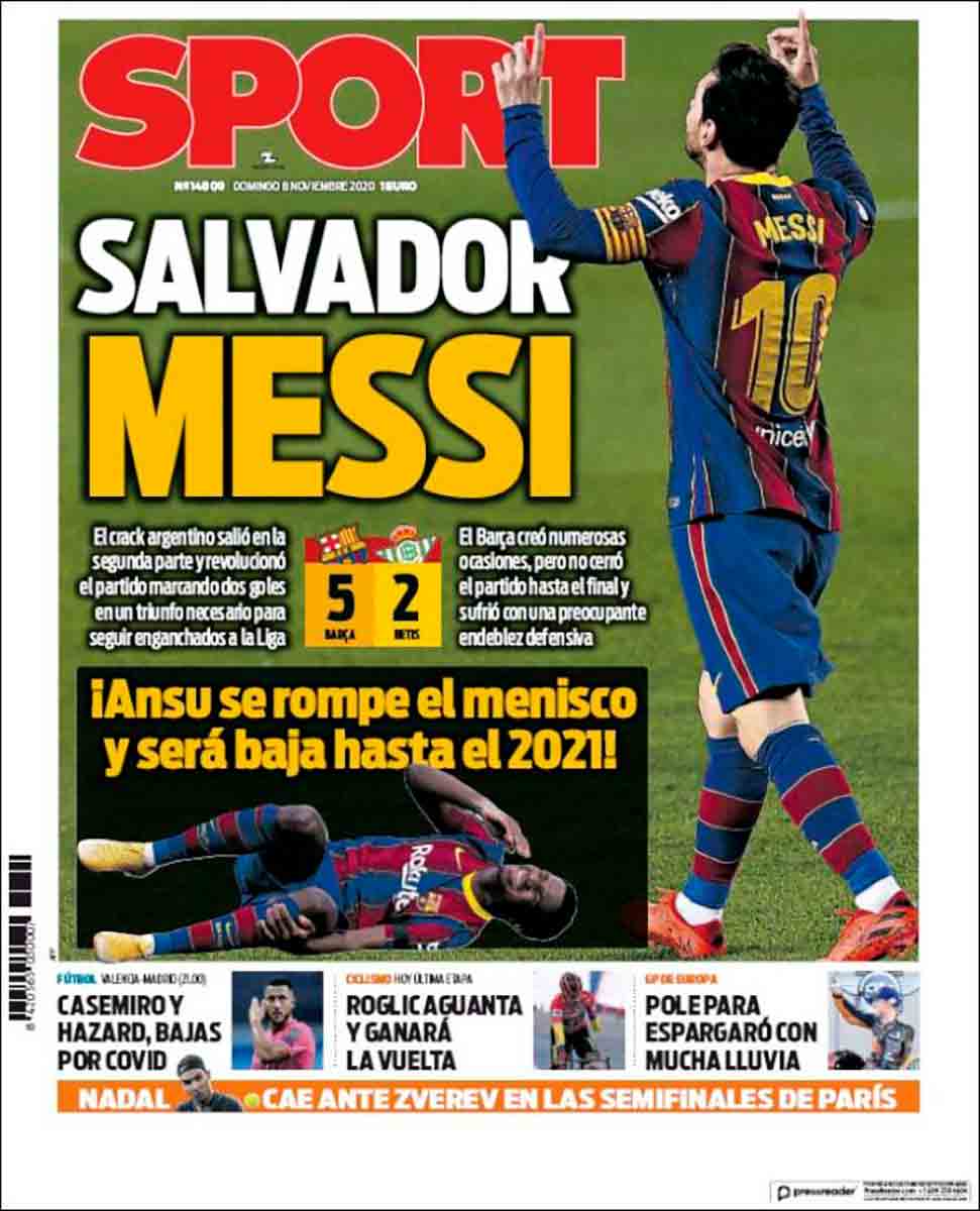 Como deseamos lo mejor en su recuperación a Ansu Fati, el joven crack azulgrana cuyo menisco acabó reventado ayer en una desgraciada jugada. Una pena para este chico que acaba de estrenar mayoría de edad y que puede estar de baja entre tres y cinco meses. El gesto de dolor del chaval aparece en la portada de Sport, pero como siempre ocurre en las victorias en los medios cataculés, nada puede restar méritos ni focos de atención a Su Cuccitinez:
