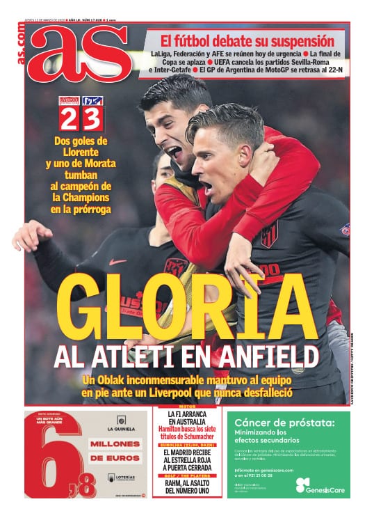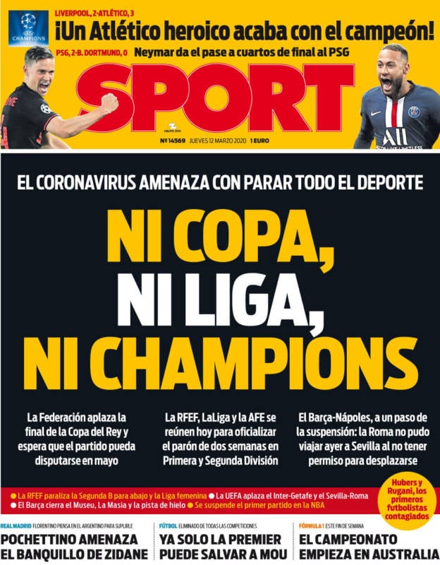 Todo está a un paso de ser cancelado o pospuesto. El fútbol, la razón de ser de esta vuestra pagina, será puesto en cuarentena también, y más pronto que tarde. Puede ser cuestión de horas. Por eso resulta tan dantescamente fuera de contexto el que ayer se jugaran partidos de fútbol cuando ya se sabe que las competiciones van a suspenderse. Sí sabemos de la necesidad de protegernos, es un sinsentido, un sindiós el que ayer se juntaran decenas de miles de personas en Anfield, por ejemplo. Un Anfield que contempló una victoria del Atlético de Madrid que hoy se viste de épica en las portadas, y que tal vez lo fuera en el contexto aislado de noventa minutos sobre un campo de fútbol cuyas gradas, como en resto de gradas del planeta, van a quedar vacías no sabemos por cuanto tiempo. No sabemos si fue épica en ese contexto aislado, pero sí sabemos que es a esa misma palabra (aislado) a lo que a partir de ahora debemos ceñirnos. Olvidad que suena surrealista pero evitad salir de casa, por favor. Si queréis, leed en la prensa patria los últimos coletazos de fútbol en no sabemos cuánto tiempo. Si sois del Atleti, que todo puede ser porque La Galerna concita a mucha gente, no vayáis a Neptuno a celebrar algo que, por lo demás, no va a tener ninguna trascendencia final porque esta edición de la Champions va a morir en breve, abortada en mitad de su desarrollo, como lo hará la Liga, la Copa, todo. Te lo cuenta Sport en una portada sobre un fondo negro que esta vez no pretende plasmar el trasfondo de un Madrid en crisis, sino de algo todavía muchísimo más importante que eso. Muchísimo más importante que el Real Madrid.