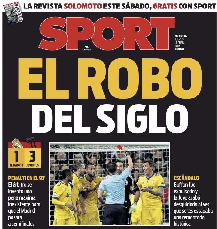 Asimetrías. Es algo más que sabido, pero no viene mal recordarlo: la prensa de Barcelona es fanáticamente barcelonista y desvergonzadamente anti-madridista. La prensa de Madrid, en cambio, pretende agradar a un público más amplio y heterogéneo, por lo que su línea editorial es mucho más tímida, cuando no es insidiosamente anti-madridista. Hoy, las portadas del Mundo Deportivo y del Sport son bochornosamente sectarias (pero esto, claro, no es nuevo); el Marca toma partido por el Madrid (pero, cuidado: pone el foco en el penalti); y el As juega a la equidistancia (los titulares no se pronuncian sobre esa jugada, y hay dos declaraciones contrapuestas de Buffon y Cristiano).