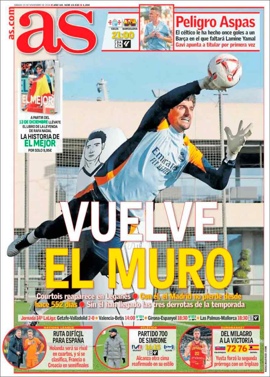 Servidor, estajanovista portanalista con una semana difícil a sus espaldas, esperaba que hoy las primeras planas brotaran como esta; facilona, sencillita, simplona. Éstas son las portadas fútiles que necesita un artesano del portanálisis un sábado por la mañana. Déjate de asambleas y torpedos obsesos bajo agendas ocultas y regálame un Courtois y un muro, una asociación entre paredes y guardametas insólita, jamás escritas en la historia de la literatura. Una maravilla portanalítica en cualquier caso a despachar en dos párrafos. O ni eso.