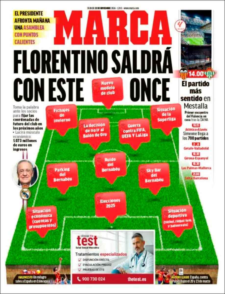 Ahí la tienen. Ahí los tienen, cubiertos de gloria de un tiempo a esta parte, jugando fuerte, incapaces de resistirse al embrujo florentino de sacudir al presidente en busca de clicks urbi et orbe, sean madridistas o antimadridistas. Tal es el ansia viva que les provoca el inquilino de la Casa Blanca que ni siquiera han aguantado su portada para el día propicio de la asamblea, léase domingo de pipiripingo, con don Ramón Álvarez de Mon vestido de frac acudiendo al cónclave blanco. La han tenido que sacar hoy, no sólo porque andan que trinan con no poder sacar cartillas de promoción de gayumbos merengones sin permiso de Floren, sino porque están requemados por el desplante Real a los premios Marca en los que Juancho Gallardo quiere ser Chris Rock y se queda en Whoopi Goldberg.  No fuimos a la tongala del Balón de Oro como para acudir a la verbena del cavernario Marca central lechero que tanto y tan bien y tan desinteresadamente quiere al Real Madrid y al madridismo.
