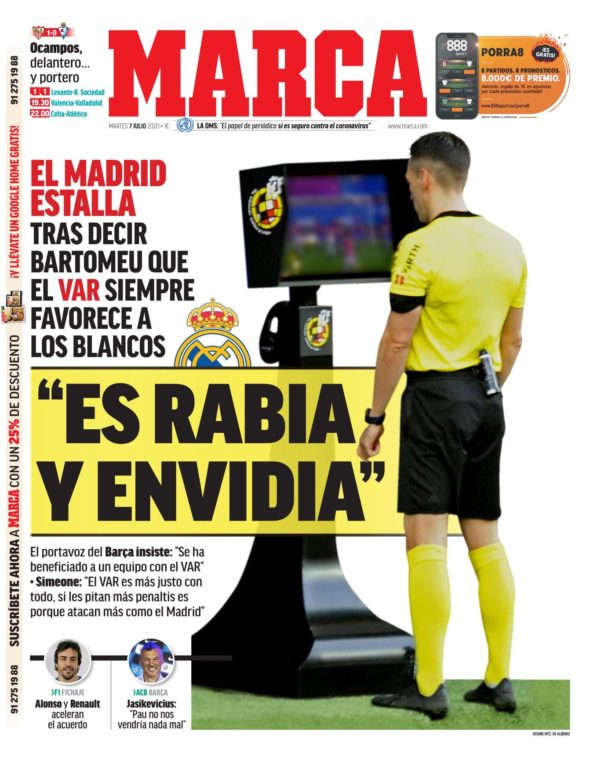 Para colmo, resaltan las palabras «Es rabia y envidia» dando a entender que se dicen desde el Real Madrid. Pero ¿quién las dice, señores de Marca? No pueden lanzar la piedra y esconder la mano. Para ilustrar sus acusaciones, muestran una pantalla borrosa de VAR observada con un árbitro que porta un objeto cilíndrico erecto cerca de sus nalgas. Y ya en letra pequeña, siguen haciendo el caldo gordo a los culés, resaltando que el portavoz del Barça insiste en que se ha beneficiado a un equipo con el VAR. Tiene que ser el mismísimo Simeone quien ponga un poco de cordura y alabe la justicia del VAR y descarte ningún tratamiento de favor al Madrid. Tiene bemoles la cosa. Ya solo falta que nos defienda Stoichkov.
