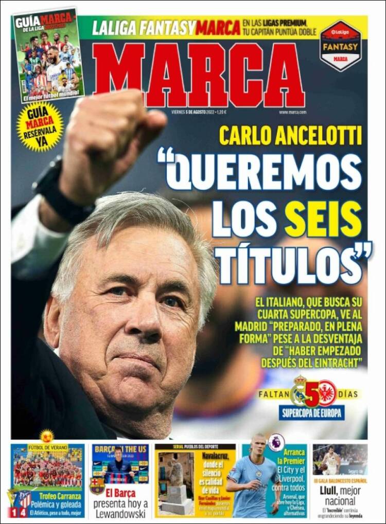 En cuanto a la prensa madrileña, poco que reseñar. Ancelotti dice que podemos ganar los seis títulos en juego y As habla del comienzo de las grandes ligas europeas, con la excepción de la española que aún debe esperar. El propio Ancelotti las ha ganado todas, y su mirada “confiante” es el único reducto de belleza en esta mañana aciaga.