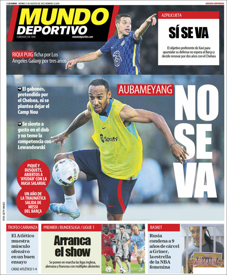 Fijaos qué forma tan curiosa de contarlo tienen los de Mundo Deportivo. Por oposición a Aubameyang, que según ellos “no se va”, el que “sí se va” es Azpilicueta. En primer lugar, llama la atención cómo evitan la fórmula “se queda”, sin duda para evitar un eco de la legendaria foto de Piqué con Neymar, utilizando a cambio la más retorcida variante “no se va”.