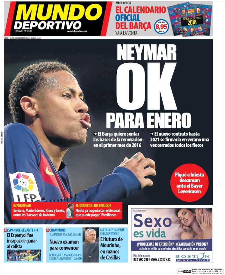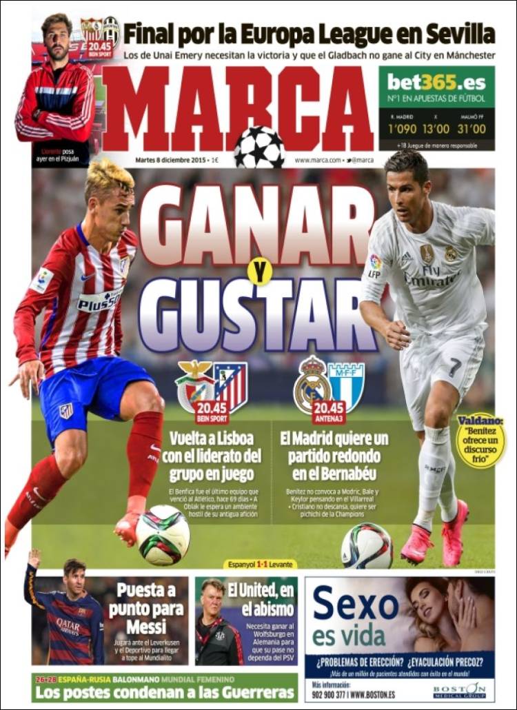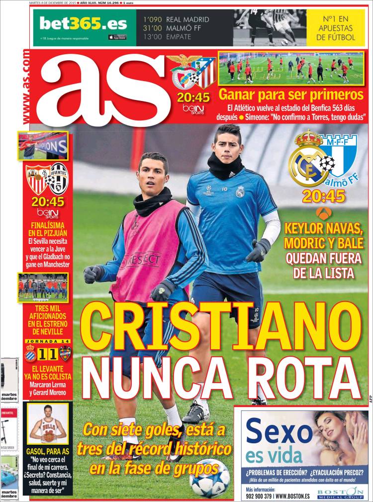 Aparentemente, la portada de Marca viene hoy más neutra y dispuesta a bailar un chotis, pues los dos equipos de la capital del reino sirven de contenido para la simetría formal perfecta de una madrileña noche de Champions. Ocurre que, más allá de la forma de la portada, los textos que acompañan a los bailarines no están al servicio de la misma simetría, ya que la información que se da sobre el partido del Atleti es digna de un telediario y la que tiene que ver con el Madrid es digna del diario As. En consecuencia, también Marca hace hincapié en el no descanso de Cristiano y también insinúa que tal cosa se explica porque -este "porque" es lo que nos escatiman en la frase alusiva- quiere ser el máximo goleador de la Champions.