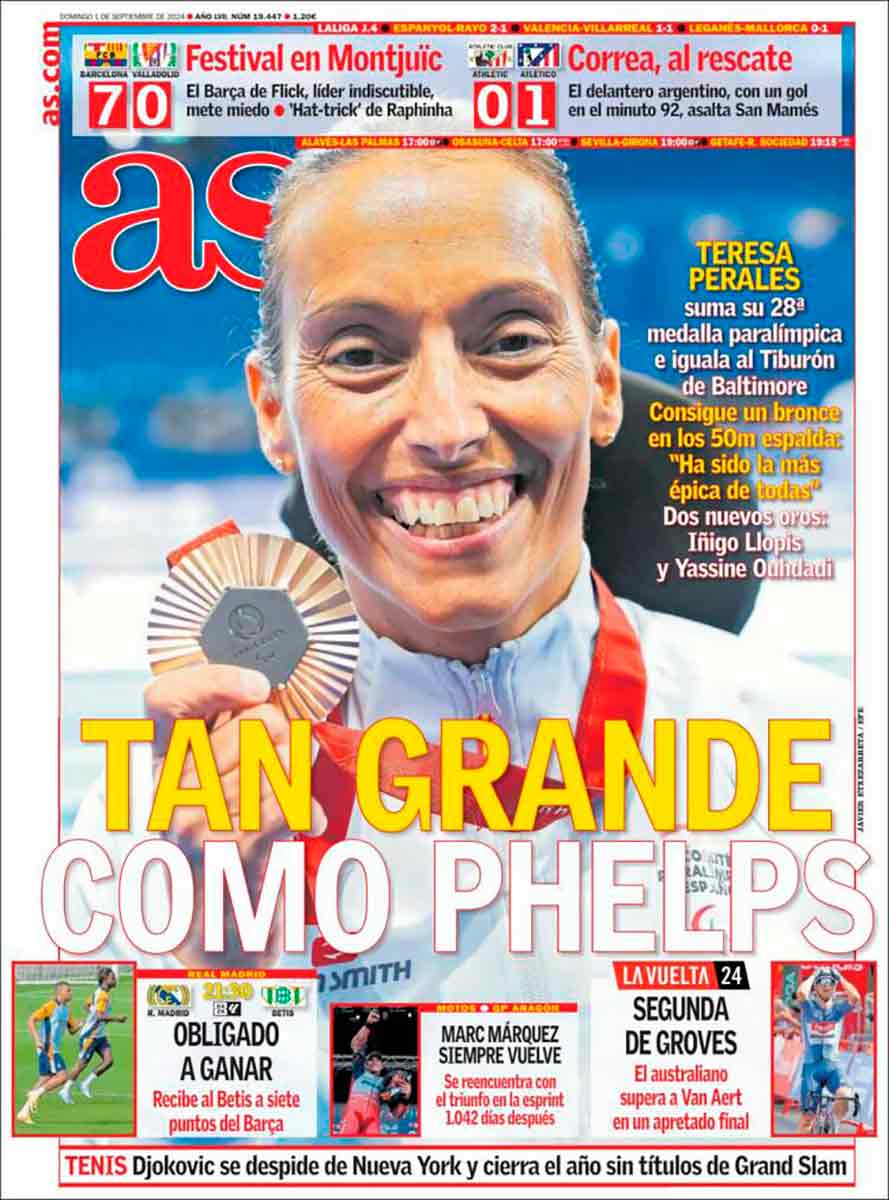 La prensa madrileña dedica sus portadas de manera merecida a Teresa Perales, que con su bronce de ayer en los Juegos Paralímpicos de París iguala en número de medallas a Phelps. 48 años, 7 Juegos Olímpicos y 28 medallas. Una deportista sublime. Vaya desde aquí nuestra felicitación y admiración. Una felicitación que ampliamos a Yassine Ouhdadi e Íñigo Llopis, quienes han obtenido sendos oros. Íñigo es hijo de Luis Llopis, grandísimo entrenador de porteros del Real Madrid.