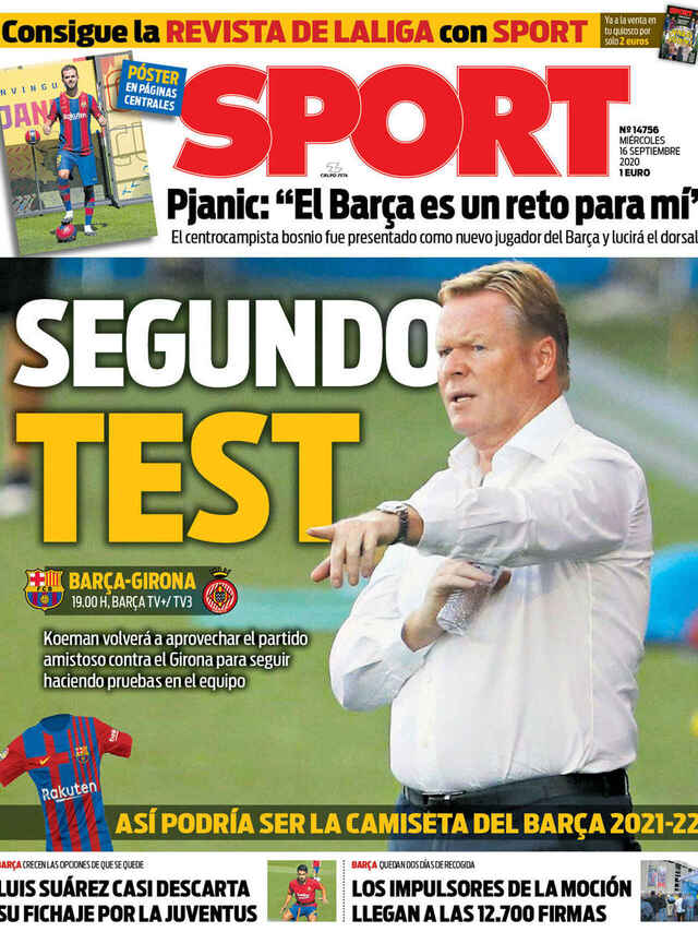 Segundo test proclama Sport en portada, al tiempo que Koeman reconoce en páginas interiores que a lo mejor hay que empezar la temporada con lo que hay, porque, entre otras cosas, no hay un duro en la caja y a Suárez no le sacan del vestuario ni con lejía. Y eso que el charrúa, que sepamos, no está representado por la Señora Barnett.