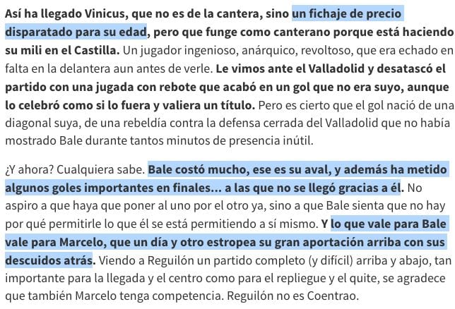 En lo que le pega a Bale con argumentos más propios de un niño de seis años, también suelta un manotazo a Marcelo y otro para Coentrao. Ambos pasaban por allí y se llevaron su parte. El artículo, repetimos, tenía la intención, o eso parecía, de ensalzar a Vinicius. Pero si intentas ensalzar a Vinicius y la primera medida es dar una hostia al brasileño, ya puedes intuir cómo será el texto del artículo. Un vómito para empezar la semana.