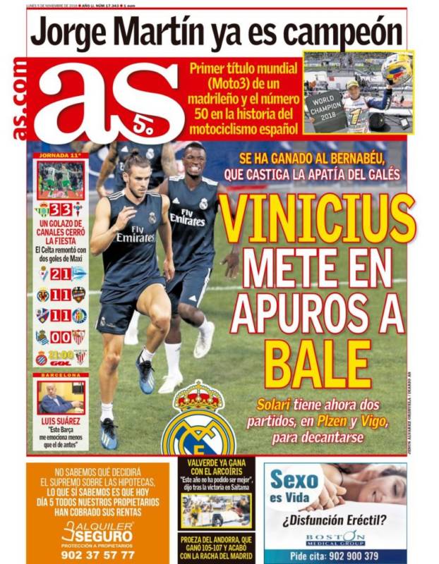 El Betis y el Celta juegan ayer domingo un partido de altísimo nivel, un piloto español se proclama campeón del mundo, pero la noticia es que el sábado "Vinicius mete en apuros a Bale". O que Messí Sí, Messi vuelve. ¡Qué panorama!