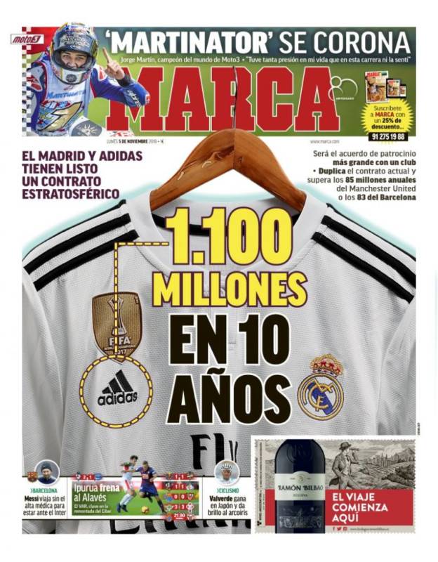 En cuanto a las portadas, poco que rascar salvo ese posible acuerdo entre Real Madrid y Adidas que le reportaría al club blanco 1.100 millones de euros en diez años. Sería, sin lugar a dudas, una extraordinaria noticia para las arcas y el futuro de la entidad. Síntoma, además, de que, desde la zona noble, las cosas se están haciendo muy bien en el apartado económico. Y eso acabará conectando con el deportivo tal y como ha sucedido en el último lustro.
