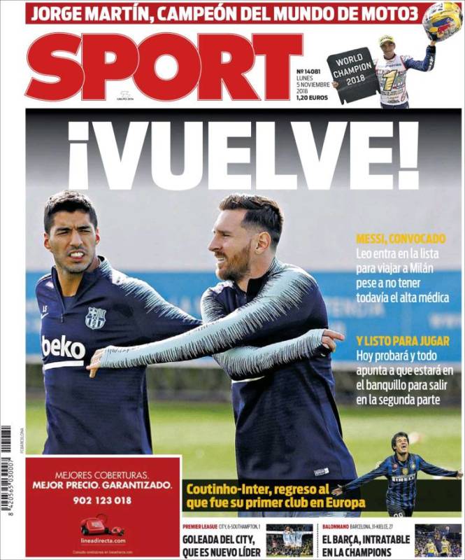 La prensa cataculé, ya para acabar, celebra el regreso de Leo Messi. Que vuelva el argentino implica que alguien tendrá que ir al banquillo. Pero eso, como es normal, no se ve como un problema en Can Barça, sino como algo lógico y puramente futbolístico. La importancia del entorno, queridos galernautas.