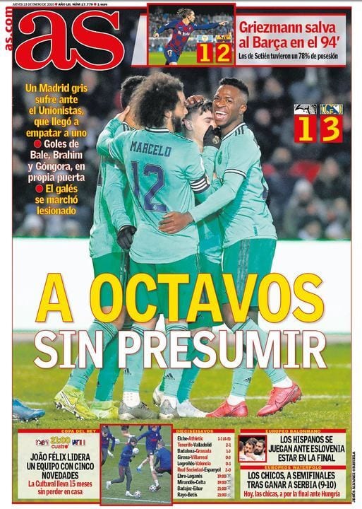 Sobre todo, para As. El adalid de la causa. En As dicen que el Madrid pasó la eliminatoria “sin presumir”, pero no se fíen de la "asepsia" (si el Madrid hubiera “presumido” ya lo estarían atizando por ello) de la portada. Es en la crónica interior donde encontramos el tesoro que nos alumbra: “... Y en ese partido repleto de incomodidades, en plena emergencia climática, metió a Bale, que llegó para decidir otros partidos y ha acabado jugando estos. Ahora anda en lo más profundo del armario. En un remate suyo, de derecha y tras roce en Ayoze, se adelantó el Madrid. Eso ha sido en gran parte su carrera, el gol desnudo, sin adornos antes ni después. La celebración fue de luto. Cierto es que un gol a un Segunda B no da para descamisarse, pero el galés compuso el rictus de quien recibe una multa de tráfico. Jugó y se comportó a temperatura ambiente. Mandó el enésimo mensaje pidiendo que no le esperen y se marchó otra vez lesionado...”.