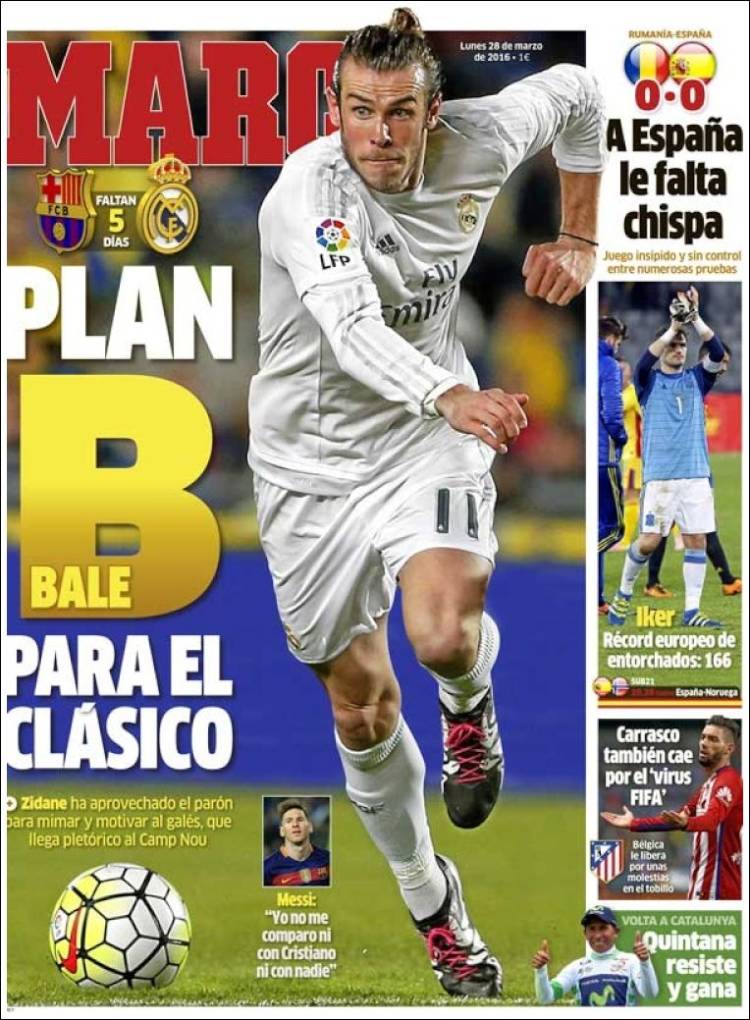 Marca señala a Bale como una de las claves del encuentro que se avecina y nos parece que muy probablemente acierta en su estimación. Señala el rotativo que Zidane ha aprovechado la ausencia del galés en los amistosos de su Selección para "mimarlo" y azuzar su motivación de cara al Clásico. A priori, considerando además la gran forma en la cual el de Cardiff parece haber vuelto de su última lesión, se nos antoja que un partido con espacios como el que a priori puede darse favorece las extraordinarias condiciones de Gareth. Decimos "a priori" y decimos bien, porque lo de los espacios, con el Barça, ya no es algo que deba darse por hecho. Ya se sabe que los de Lucho, como ha reconocido el propio Piqué en uno de los escasos ratos fuera de cámara que nos concede, se sienten ahora más a gusto cerrándose atrás y saliendo al contragolpe, que es estrategia que favorece el espectáculo cuando se lleva a la praxis en el nordeste de la Península Ibérica pero impropia de equipos grandes cuando la ejecuta el Real Madrid.