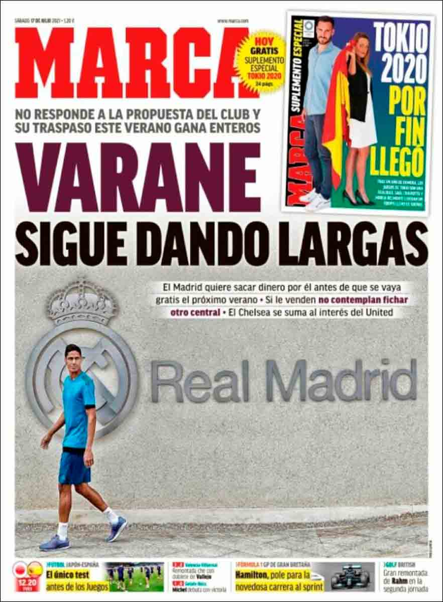 "Varane sigue dando largas", nos cuenta Marca en su portada, y nos da pena pensar en su marcha porque aquí hemos sido muy del canterano. Porque Varane es canterano, ¿no? Lleva aquí toda la vida, tiene el ADN madridista (sea lo que sea eso) y llegó con la edad de Pedri, del que no sabemos si se ha dicho durante la Eurocopa que tiene 18 años, así que, ¿podemos decir que Varane es de la cantera? La verdad es que nos da un poco igual, como nos daba igual cuando se hablaba de aquello de “Cantera vs cartera” sin contar que “los de la cantera” no jugaban gratis, sino por una “cartera” descomunal que podía llevar a un club a la ruina. Lo que no nos da igual es pensar que la salida de Varane del club puede estar cercana, así que el Real Madrid tiene que plantearse su traspaso este verano para seguir ajustando unas cuentas de las que se ha hablado poco esta semana. Que en plena pandemia el club haya tenido resultados positivos es una hazaña que ha ocupado muy poco espacio en las portadas, o ninguno, como (afortunadamente) las famosas grabaciones ilegales en las portadas de As y Marca.