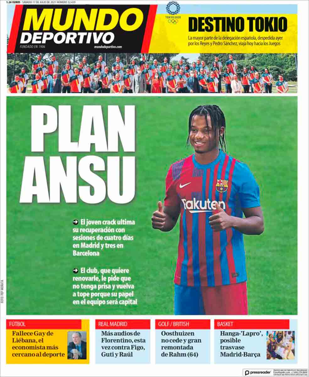 Terminamos con la portada de Mundo Deportivo, que nos trae a Ansu Fati a portada. Nos alegramos de su posible retorno y de que lo vayan a poner “a plan”, pues en unas fotos recientes parecía más bien Ansu Fat. Esperamos que se recupere bien de su grave lesión de rodilla, porque solo tiene 18 años como esperen, lo tengo en la punta de la lengua.