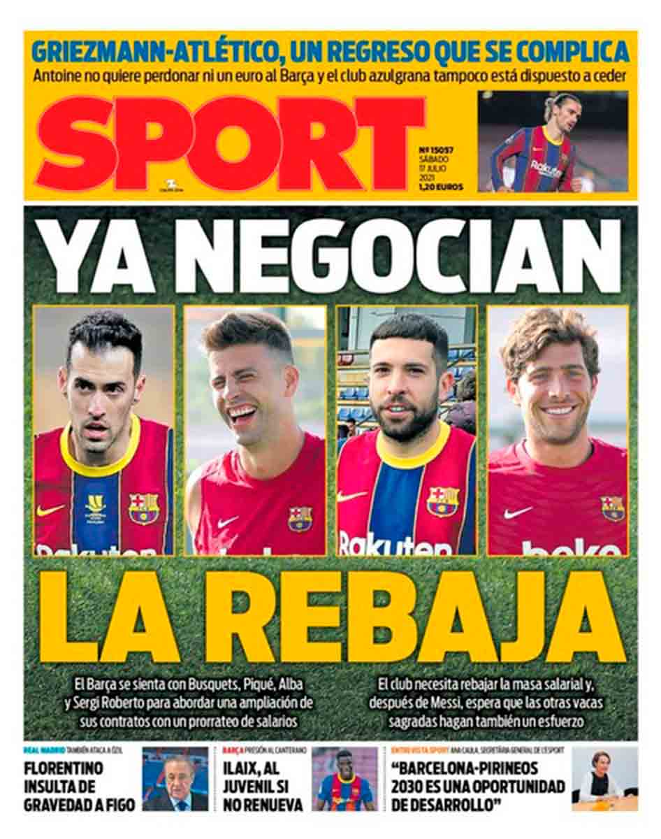 Lo mejor, como casi todos los días, lo encontramos en la prensa cataculé. Creemos que no es casual que al titular “Ya negocian la rebaja” lo acompañen las fotos de las carcajadas de Jordi Alba, Sergi Roberto y el tuitero Piqué, junto a la de Busquets con cara de decir “pero qué me estás contando”. Cantera que no juega por la cartera, exactamente igual que Leo Me$$i. Cantera que dejó un agujero enorme en la cartera, el último regalo envenenado de Bartomeu a sus sucesores. Y seguimos hablando de economía en el faldón superior, aunque llama la atención el orden escogido: “Griezmann-Atlético, un regreso que se complica”, como si fuera el Malakito quien tiene difícil su vuelta y no el Barça la salida del galo. “Antoine no quiere perdonar ni un euro al Barça (¡habráse visto desconsideración similar!) y el club azulgrana tampoco está dispuesto a ceder”. Gay de Liébana se retorcería de dolor si leyera estas lecciones de economía de mercadillo, de bazar turco.