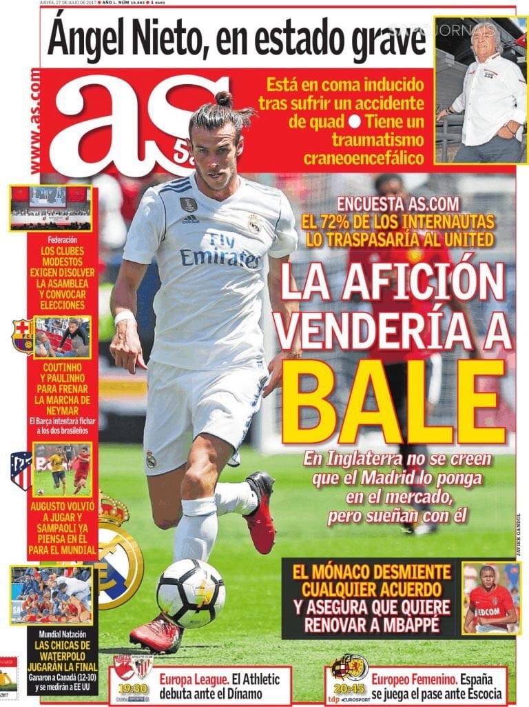 Buenos días: vista la portada del As compruebo que sigue en la línea que ayer comentaba yo. Que la campaña de este panfleto que en su día fue un periódico (hace muchos años, cuando se publicaba en blanco y negro y pasaban por ahí Rienzi y Sarmiento Birba) contra Gareth Bale iba a continuar sin descanso y sin dar un respiro. Se dice que el periódico va mal, que si están ahogados económicamente, que si han perdido lectores.... pero pasan los meses y las temporadas y ahí están y hay miles de madridistas que lo leen y les bailan el agua. Es incomprensible y no parece que tengan tan mala salud económica como se dice. Lo único que puede hacerse al respecto desde el Real Madrid es no dejarse llevar, como en su día hubo presidentes (Calderón, Sanz) que se dejaron llevar por el vulgo y que Gareth Bale siga en el equipo y por muchos años. fieles a su línea anti-Bale en la crónica del partido contra el City lo señalan junto a Benzema (¡oh, casualidad!) como los culpables del 4 a 1. El partido no lo he visto así que no opino pero me llama la atención que hasta el minuto 62 que Zidane hizo un carrusel de cambios, el equipo que puso el entrenador era un equipo perfectamente titular para un partido de liga o demás, incluida la defensa y el centro del campo. pero no, los responsables fueron Benzema y Bale, siempre Bale, el eterno culpable Bale. Por supuesto, la solución la tenía el que ya no está, Morata, con Morata otro gallo habría cantado. Da AS-co.