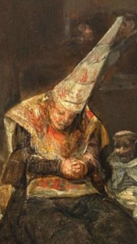 Ya solo falta que un tribunal inquisitorio le condene a recibir 200 latigazos en plaza pública, como en los tristemente célebres autos de fe del siglo XVIII en la Plaza Mayor de Madrid, con el pobre Gareth ataviado con su correspondiente sambenito, una triste túnica de tela grosera y con unos demonios pintados a su espalda mientras unos dragones - quizás galeses - escupen fuego mostrando la ruta hacia el Averno para el condenado. Por supuesto que Bale portaría además su correspondiente coroza - o capirote -, ese gorro puntiagudo pintado con llamas para mostrar sus imperdonables herejías.