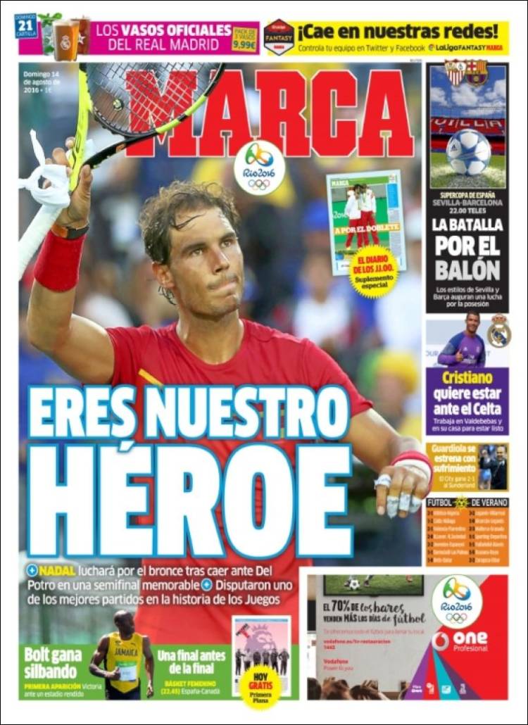 Marca sabe bien que Nadal solo hay uno, y por eso le dedica hoy su portada aun habiendo perdido ayer con Del Potro, en "una semifinal memorable" que el de Manacor no pudo finalmente llevarse, de tan extenuante agenda como está teniendo en estos Juegos. Pero qué importa. Perder así no es perder, diga lo que diga el color de las medallas y Dios salve a Pierre de Coubertin.