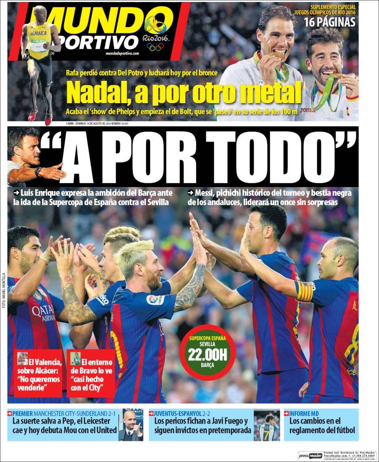 Más prosaica viene hoy la prensa deportiva catalana, con titulares alejados de la metafísica, más bien poco meditados y centrados en querer ganar el título en disputa. "A por todo" va Luis Enrique desde la portada de Mundo Deportivo y "esto va en serio" dice la de Sport, aunque disculpen ustedes si eso de la seriedad no nos termina de casar del todo con el rubio Eurythmics de Messi (back to the eighties!) y menos aún con el "ahora me voy, ahora me quedo" que el argentino ha protagonizado estos días con respecto a su selección.