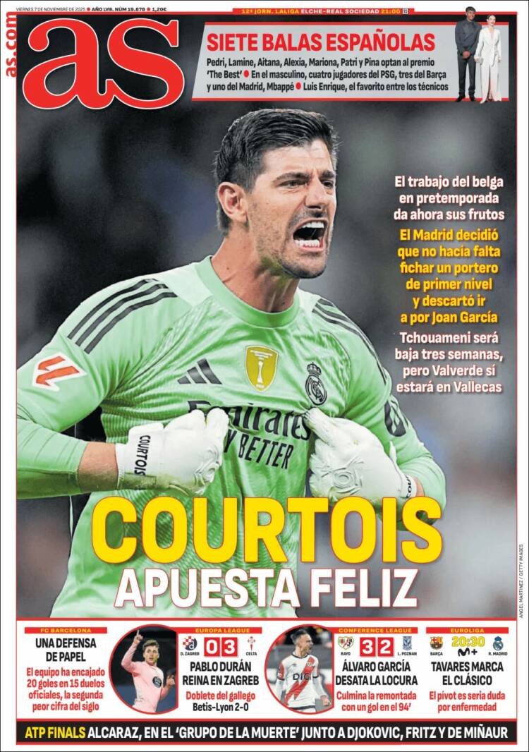 Hablando de santos, venerables y beatos, el Diario Anteriormente Dirigido por Relaño, y ahora por José Félix Díaz, pone en portada a San Teobaldo de Bree, es decir, nuestro Tibu Courtois con gesto victorioso y de rabia, como diciendo “aquí estoy yo en el lado bueno de la historia”. Enuncia el redactor “Courtois, apuesta feliz”. Si fichar a Courtois es una apuesta, tiene menos emoción que pescar en un barril o bailar con la hermana propia, pero allá cada uno con su nivel de autoexigencia al diseñar sus portadas.