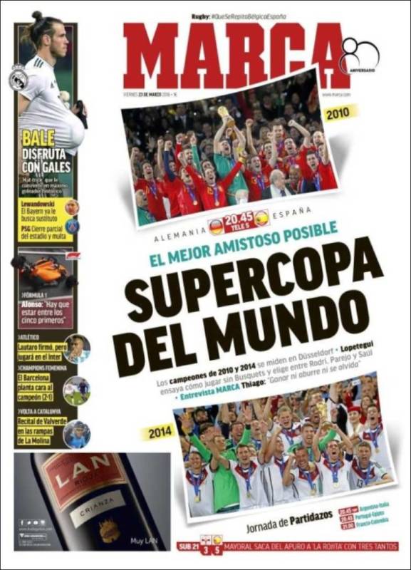 Uno titula a todo color ¡La Supercopa del Mundo! , convoca a la imperial Mannschaft y apela al orgullo patrio con tal de vender su primera plana y no se da cuenta la Hernia de que los ojos del lector galernauta inmediatamente se posan preocupados sobre el estado de buena esperanza de Gareth en la esquina superior izquierda. La imagen es una buena metáfora del tratamiento mediático recibido en España por todo un gentleman británico como Gareth: le han hecho un bombo.