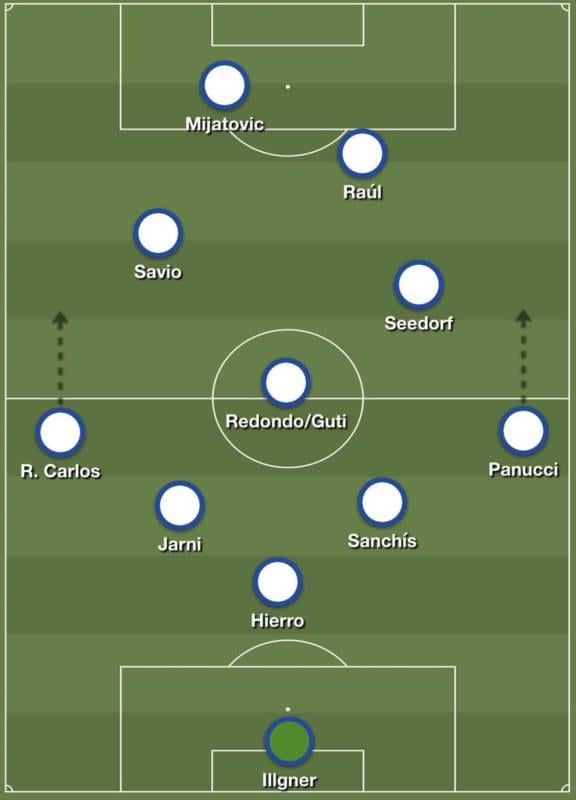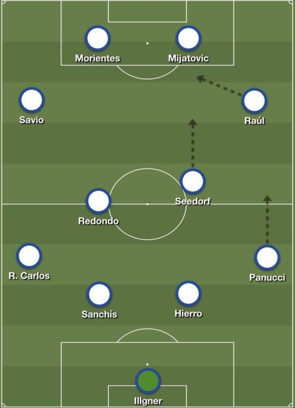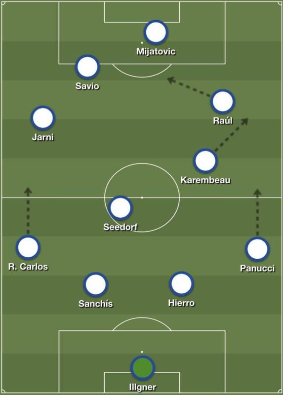Ya en campo rival, la creatividad a la que se refería Hiddink se mezclaba con la libertad de movimientos y ejecuciones permitida tanto al mediocentro más liberado como a los cuatro futbolistas de ataque, en cuyas capacidades confiaba. Savio había dicho que su principal característica era la velocidad, pero que le gustaba "hacer driblings, caños, bicicletas… Inventar, en definitiva", y el técnico completó su visión de tolerancia con la inventiva afirmando que Raúl tendría que jugar en la derecha, pero con libertad para salir cuando quisiese. Seedorf fue el nexo entre la defensa y el ataque en transición, y el mediocentro más atrasado fue un Redondo que se perdió varias citas por lesión, entrando en su lugar Guti en el mes de enero, sobre cuyo novedoso rol Hiddink explicó que había jugado en una posición más defensiva de lo normal porque quería que jugara más para el equipo.