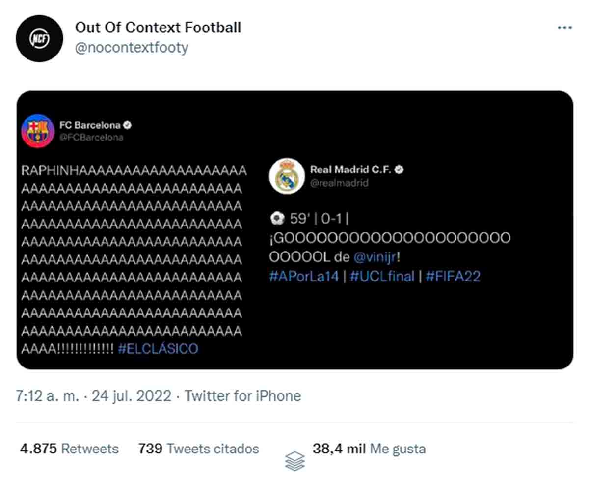 En esta captura se aprecia la diferencia entre Real Madrid y Barça. El Barcelona celebra un gol en un amistoso contra el Madrid disputado un 24 de julio en Las Vegas con una explosión de júbilo que consume el límite de caracteres permitidos en un tuit y la cantidad de alipori soportable por un ser humano funcional. Contrasta con la celebración por parte del Madrid del tanto de Vinícius contra el Liverpool que a la postre le permitió levantar su decimocuarta Champions. La naturaleza del Barça es la de equipo segundón que celebra por todo lo alto las victorias en amistosos, las clasificaciones para Europa League o los no fichajes del rival. Del mismo modo que clubes estado como PSG o City no consiguen comprar Copas de Europa, la grandeza se tiene o no se tiene. Y el Madrid la tiene.