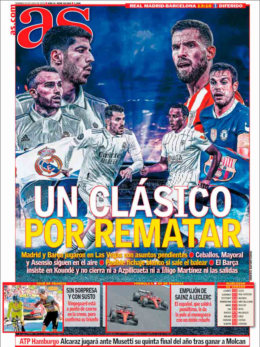 La localización de Las Vegas y la existencia de husos horarios provocan que la visión de las portadas de hoy sea un regreso al pasado. Como es natural, en el momento de la publicación de las mismas aún no se había disputado el Barcelona-Real Madrid, por lo que su interés respecto al principal asunto que nos atañe es nulo.