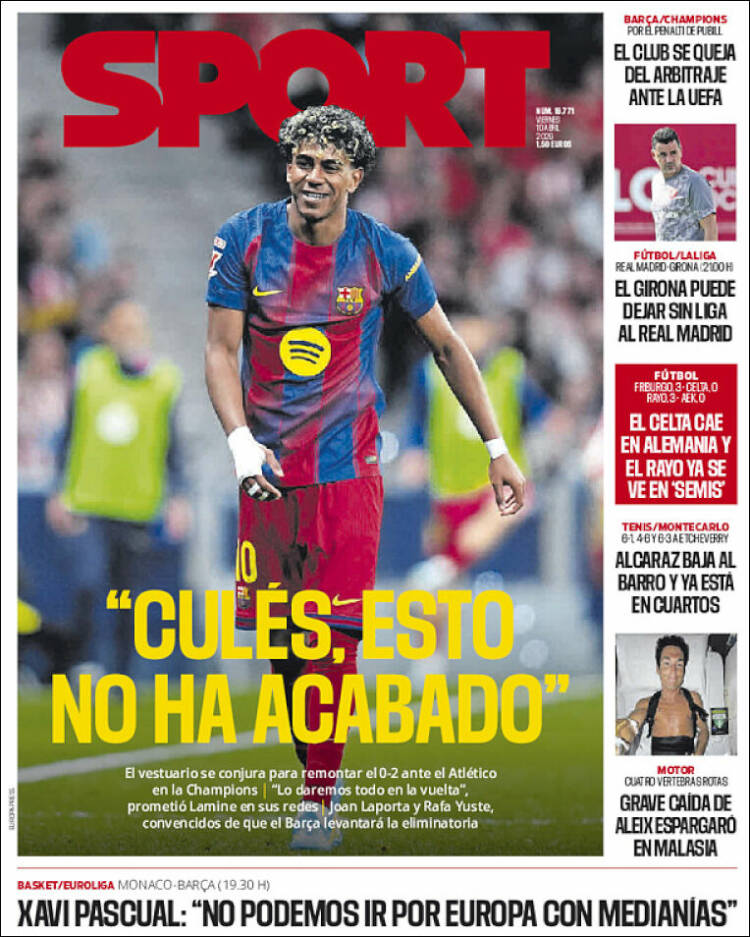 Mundo Deportivo planta en su frontispicio un enorme “INDIGNACIÓN” troceado y cayendo a modo de tetris junto a Kovacs. Sport elige a Lamine para su portada, ese jugador tan determinante en los partidos importantes de Champions.