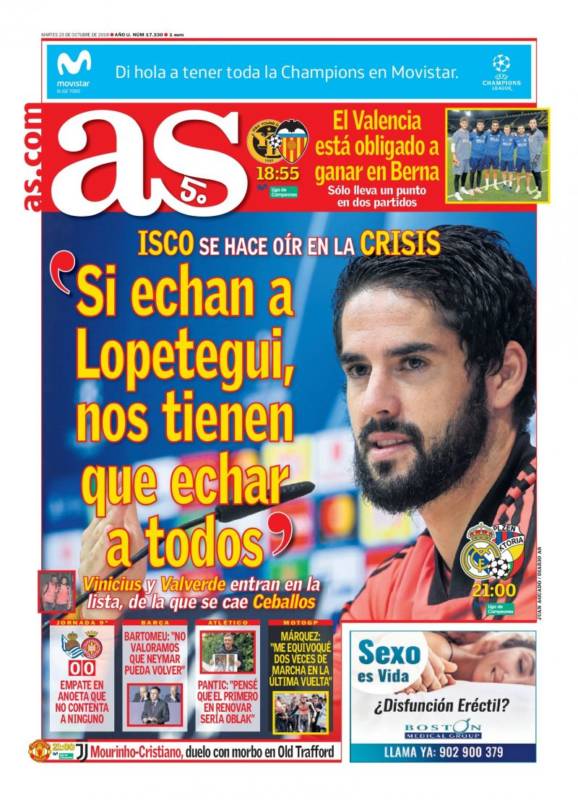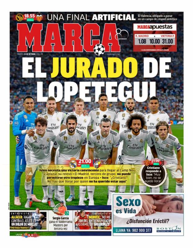 Buenos días. Hoy todo el mundo habla de la agonía de Lopetegui y se hacen quinielas sobre si el partido ante el Viktoria Plzen será el último del técnico merengue o habrá que esperar al Clásico. Para eso ha quedado la prensa, para hacer quinielas, ya que de información, sobre todo en lo que concierne al Real Madrid, van bastante juntitos.