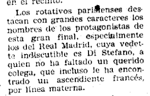 Indudablemente el madridista que concitaba mayor atención mediática, tanto española como internacional, era Alfredo Di Stefano. El diario Mundo Deportivo, antes de la final de la Copa de Europa, destacó lo mucho que le habían piropeado los rotativos franceses, orgullosos incluso de poder reivindicarle como un poco propio al tener la madre del astro ascendencia francesa. Se subrayó además el impacto que había producido entre los aficionados europeos la victoria blanca ante un Milan cuajado de estrellas. Mientras que en el otro lado del ring, por parte de los franceses, el gran hombre a seguir era el atacante de origen polaco Kopa.