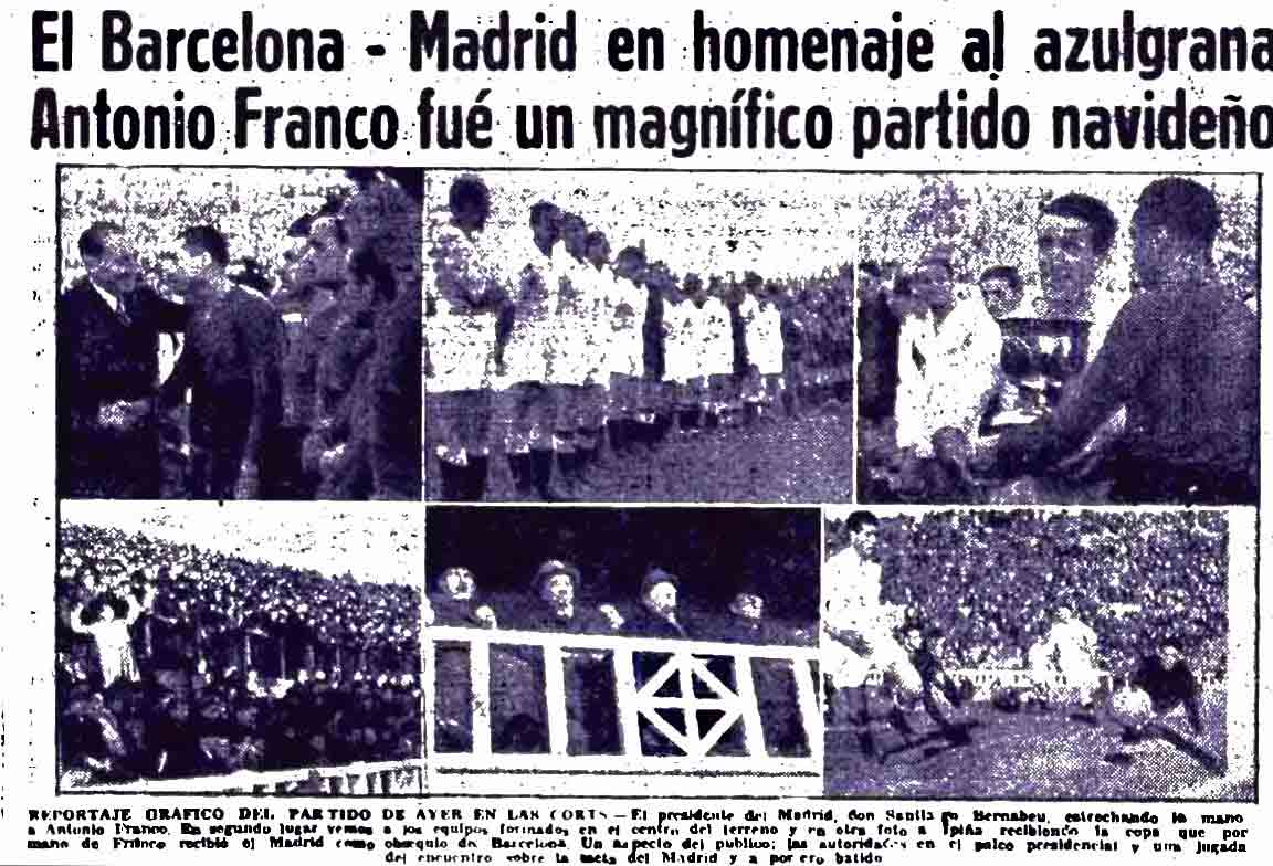 Casi dos meses después, el 26 de diciembre, el Real Madrid devolvió la visita al F.C. Barcelona que homenajeaba a un Antonio Franco que estaba cerca de colgar las botas. El centrocampista leridano llegó al cuadro catalán en 1934 procedente del RCD Español, vistió la camiseta blaugrana en más de un centenar de ocasiones pese a la guerra civil y fue capitán del equipo.