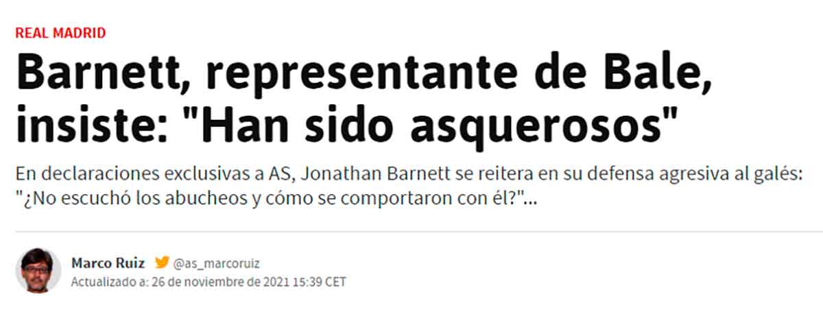 La polémica surge de unas declaraciones en las que Jonathan Barnett dice que no le importa lo que digan los aficionados del Real Madrid porque están siendo asquerosos con Bale. Estas palabras son, cuanto menos, muy desafortunadas, en la línea que siempre ha mantenido el representante de Gareth que, ojo, también lo es de Camavinga. Que un señor que trabaja para más de un futbolista del club califique a los aficionados del Madrid como asquerosos es un asunto grave que podría haber sido muy grave si el propio Gareth lo hubiera refrendado. De modo que el interés primordial radicaba en saber si Barnett hablaba o no por Bale. El propio Barnett se encargó de esclarecerlo: