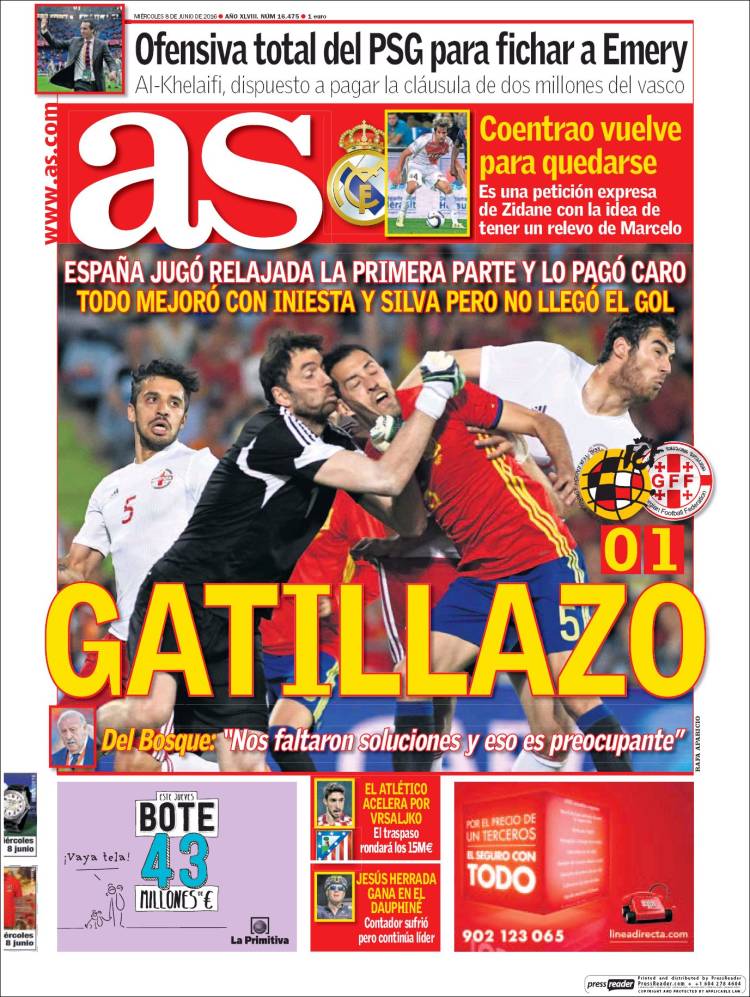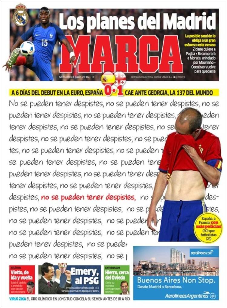 The Hernia Chronicle nos regala hoy una portada gallifante que evoca a Bart en la cabecera de Los Simpson. Efectivamente, galernautas: es para quedarse un poco amarillo. Gatillazo lo describe picarón por su parte el Dailly Ouija, un diario cuya flacidez informativa ha quedado sobradamente acreditada estos días después de que Florentino, Pepe, Benzema y Carvajal desfilaran por la portada de su competidor Marca. Qué bonito titular es Gatillazo. Tanto que, bien pensado, y modificando lo inicialmente anunciado, vamos a combinarlo con el de Sport para formar el nuestro propio.